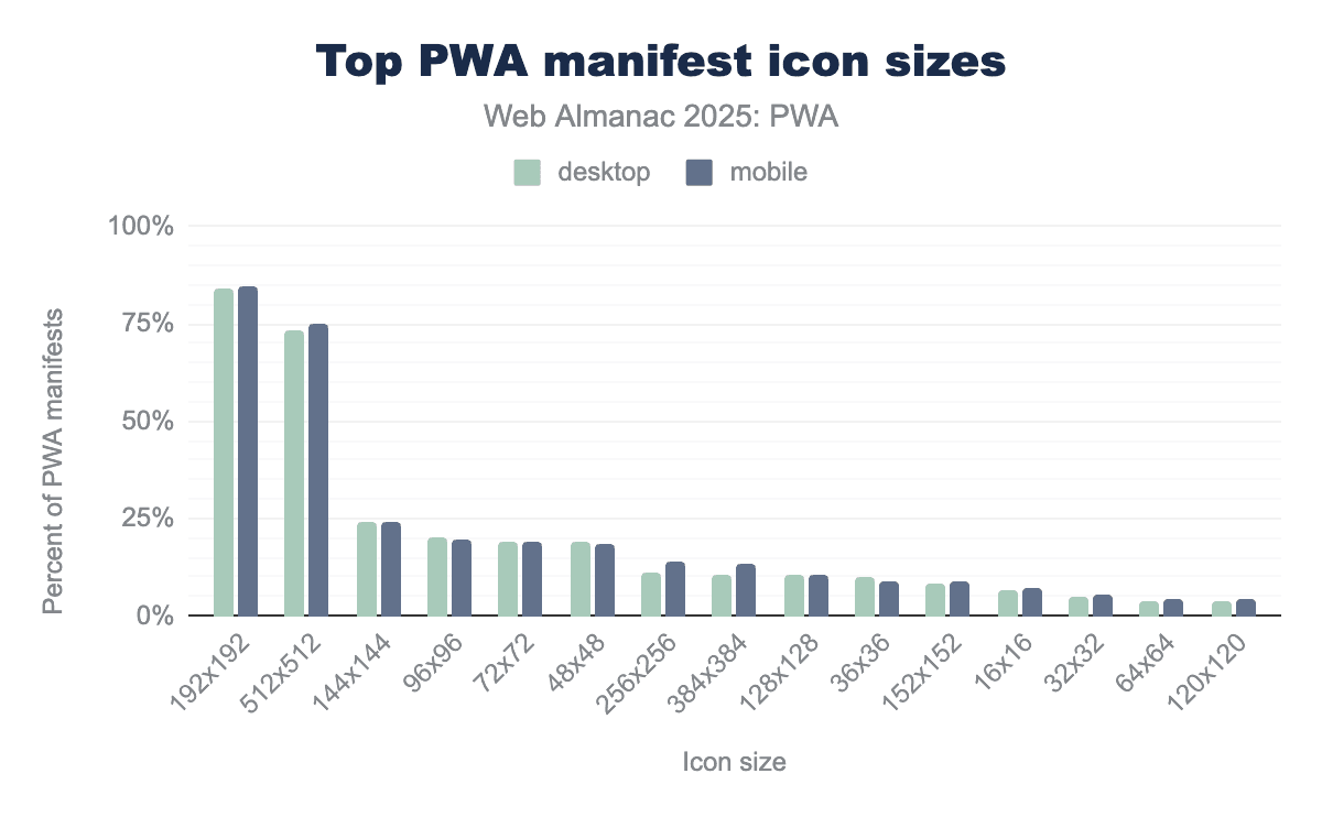We’ve seen the latest data on what the most used service worker and manifest features are. In 2025, we can see that roughly one fifth of sites use service workers, and roughly one tenth use manifests.