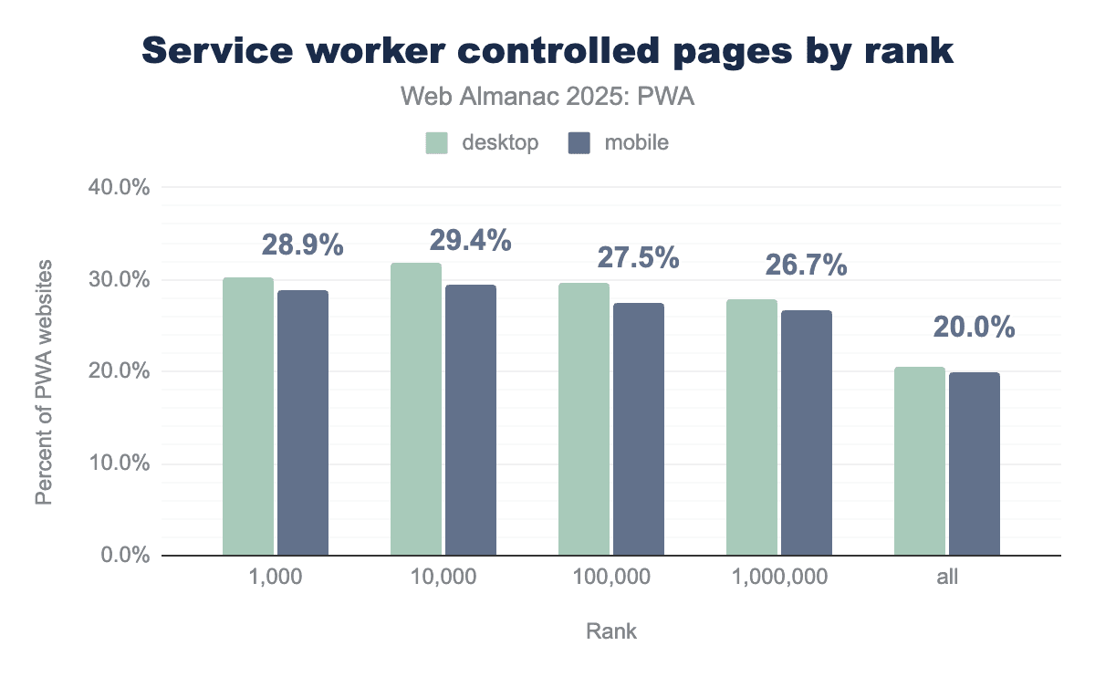 - Service worker controlled pages have gone up around 20% for all PWA websites from 2022.