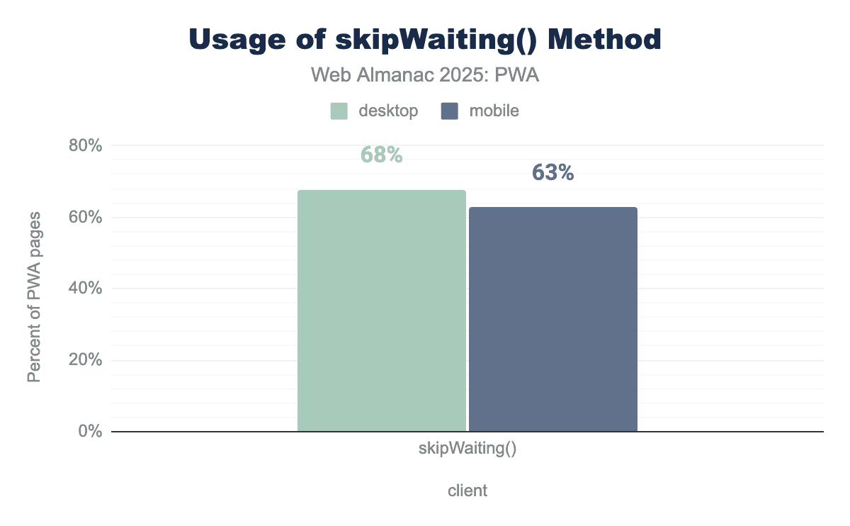 skipWaiting being used on approximately 68% of desktop PWA pages and 63% of mobile PWA pages.Looking at the most used service worker method, skipWaiting() has a notable use, with 68% usage on desktop and 63% on mobile. The browser will activate the service worker and replace the old one immediately. This implies developers are keen to ensure users don’t get stuck with stale assets. This is beneficial for applications that require frequent updates, like dashboards and messaging apps. It basically helps users get the latest version of the application right away.